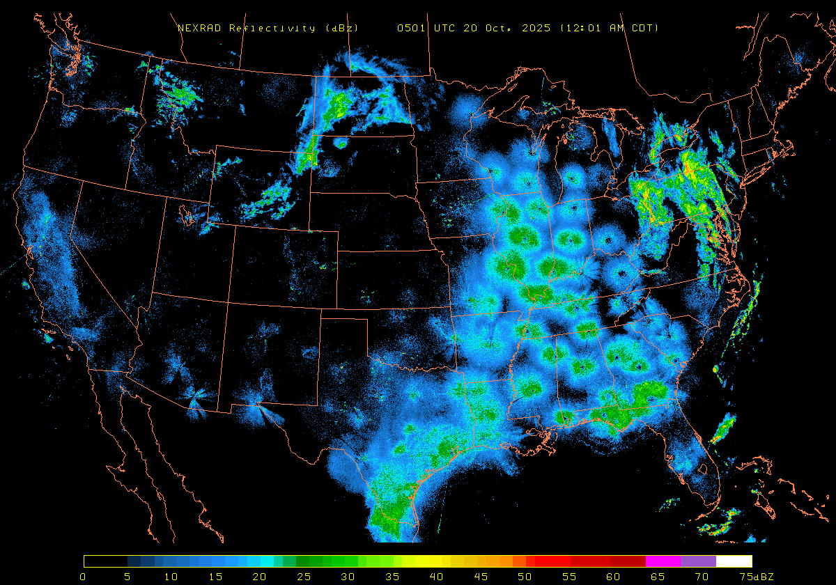 NEXRAD Base Reflectivity & Wind Maps: October 19, 2025 at 3pm ET to next day at 3pm (2 frames/hour)