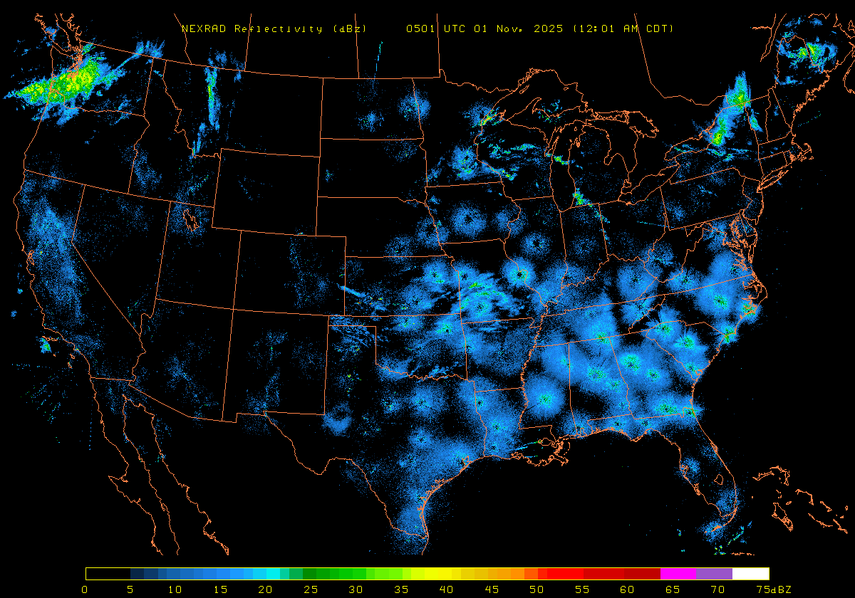NEXRAD Base Reflectivity & Wind Maps: October 31, 2025 at 3pm ET to next day at 3pm (2 frames/hour)