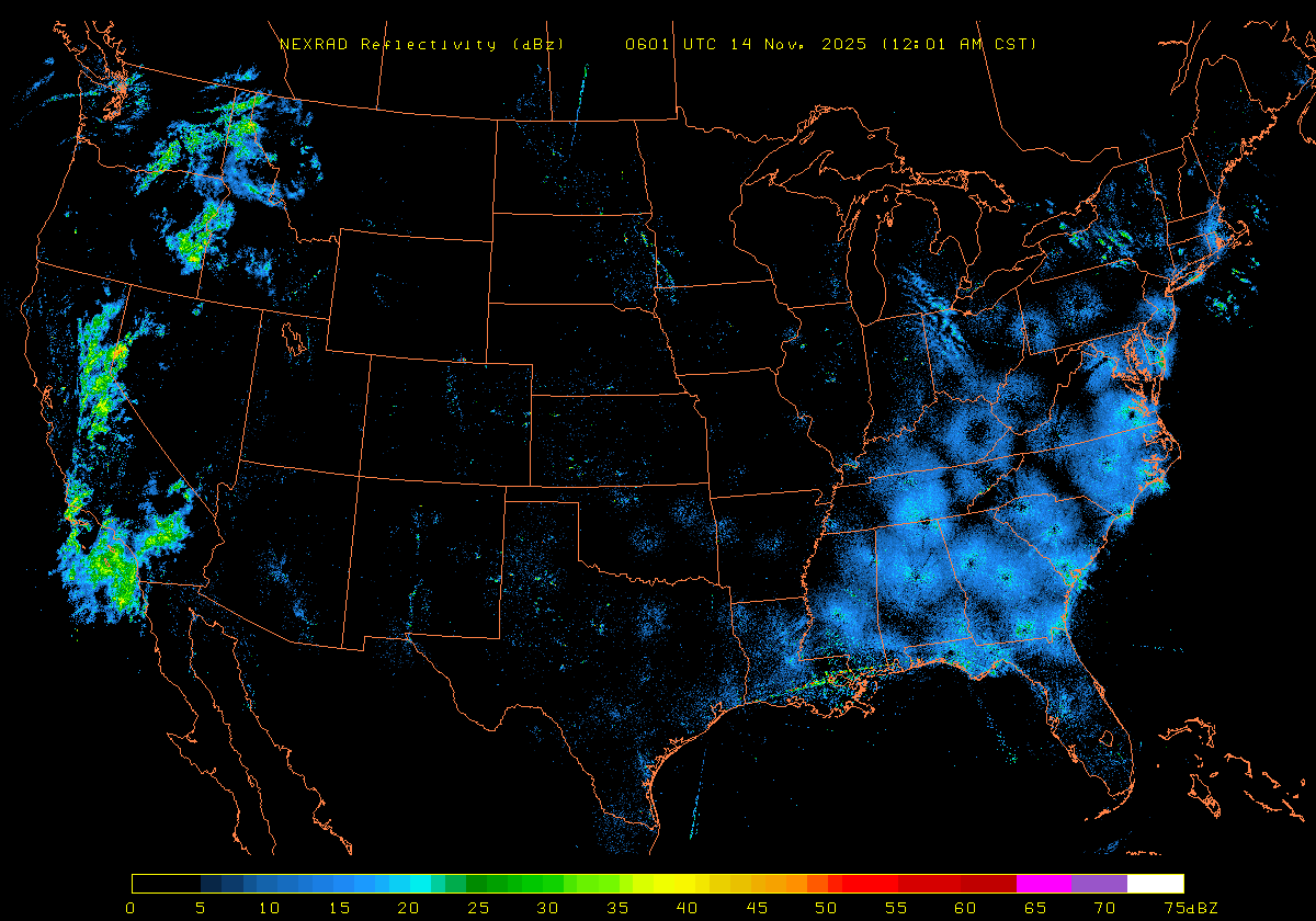 NEXRAD Base Reflectivity & Wind Maps: November 13, 2025 at 3pm ET to next day at 3pm (2 frames/hour)