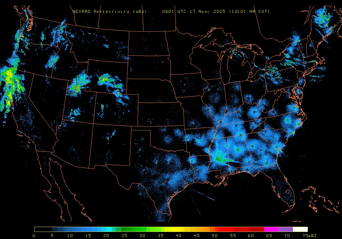 NEXRAD Base Reflectivity & Wind Maps: November 16, 2025 at 3pm ET to next day at 3pm (2 frames/hour)