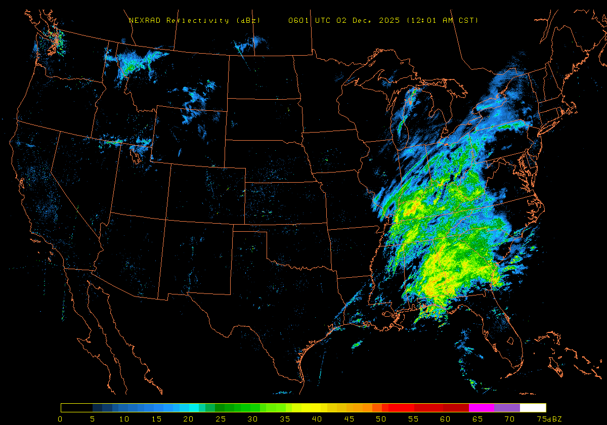 NEXRAD Base Reflectivity & Wind Maps: December 1, 2025 at 3pm ET to next day at 3pm (2 frames/hour)