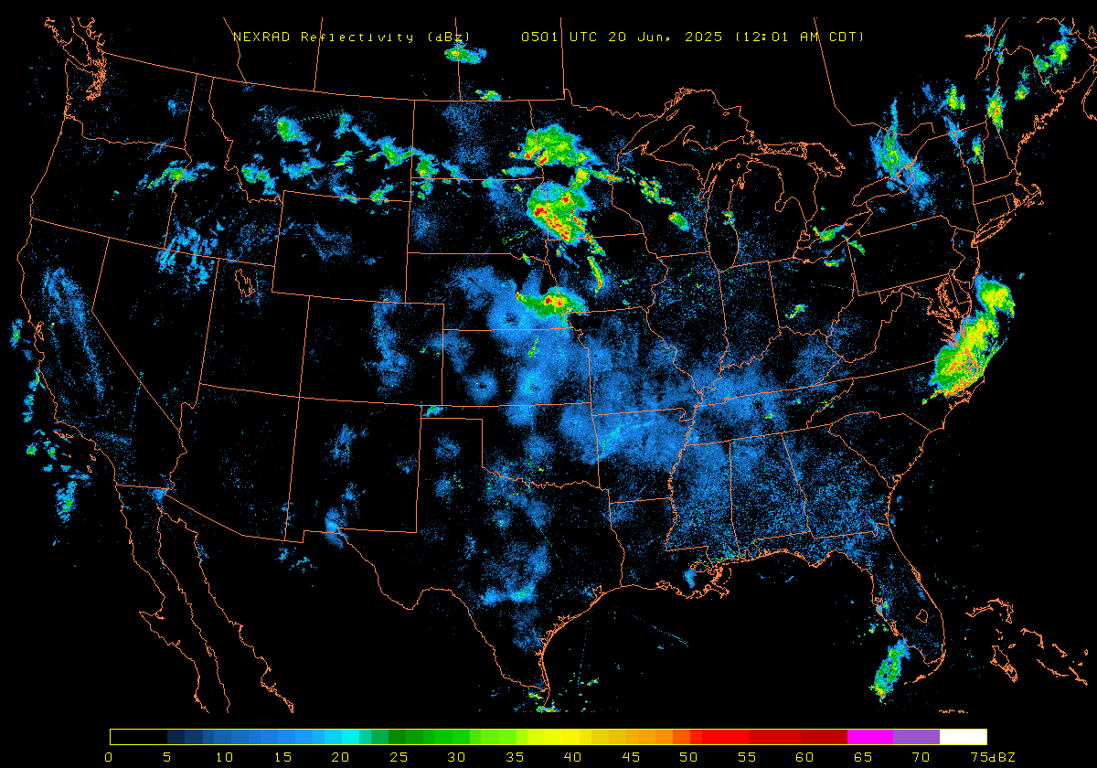 NEXRAD Base Reflectivity & Wind Maps: June 19, 2025 at 3pm ET to next day at 3pm (2 frames/hour)