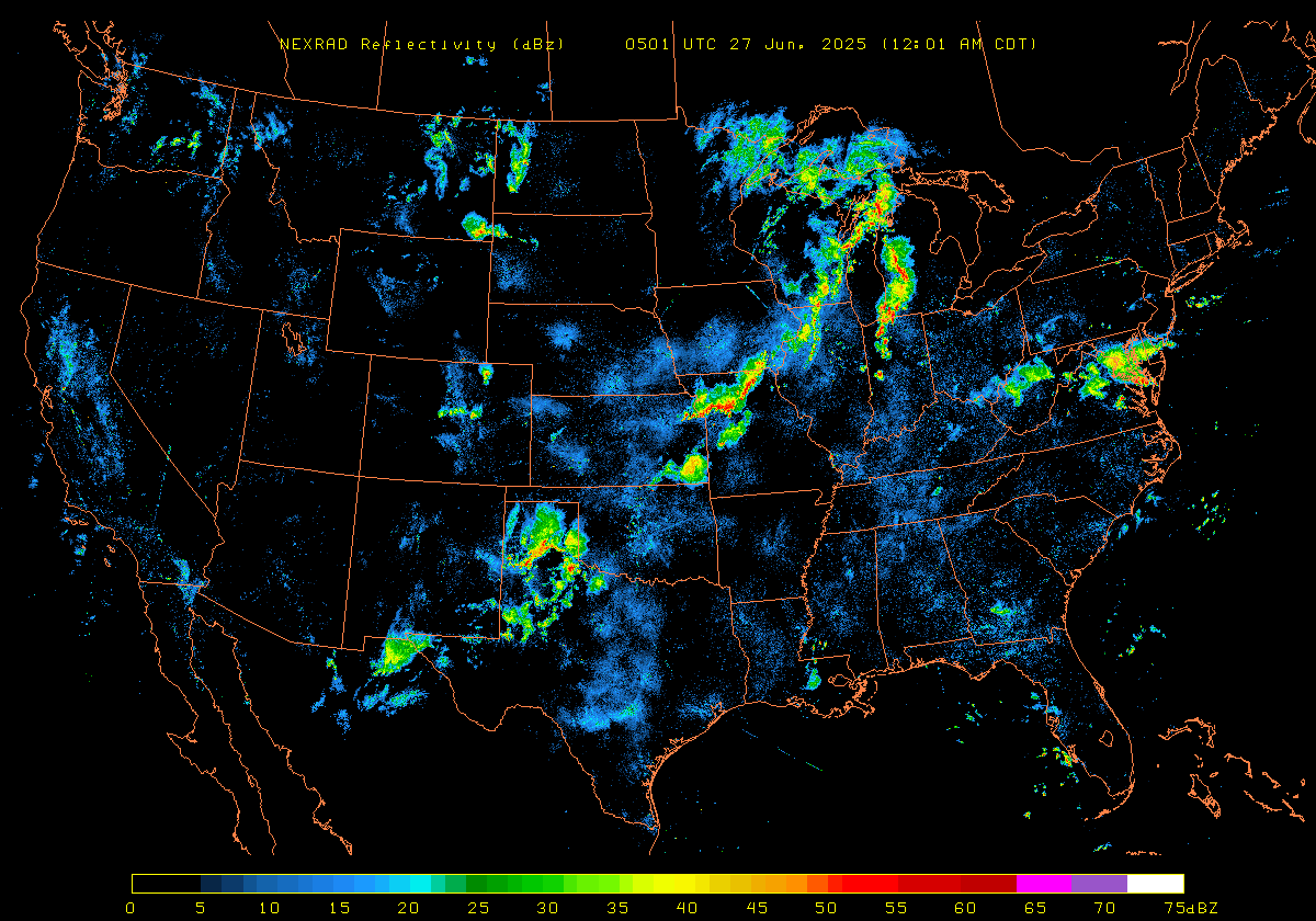 NEXRAD Base Reflectivity & Wind Maps: June 26, 2025 at 3pm ET to next day at 3pm (2 frames/hour)