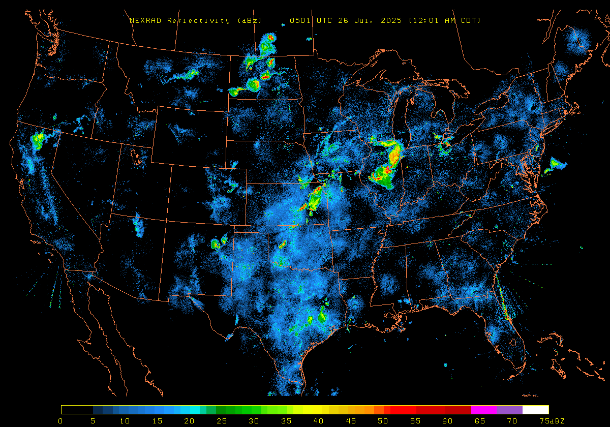 NEXRAD Base Reflectivity & Wind Maps: July 25, 2025 at 3pm ET to next day at 3pm (2 frames/hour)