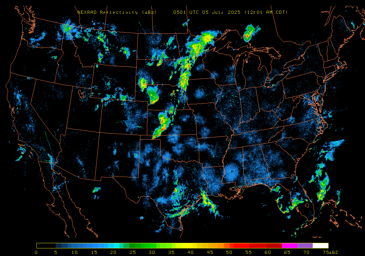 NEXRAD Base Reflectivity & Wind Maps: July 4, 2025 at 3pm ET to next day at 3pm (2 frames/hour)