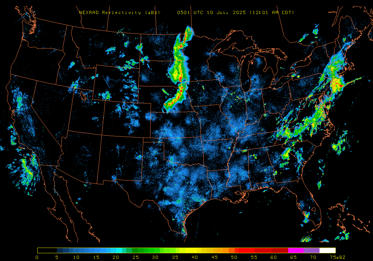 NEXRAD Base Reflectivity & Wind Maps: July 9, 2025 at 3pm ET to next day at 3pm (2 frames/hour)