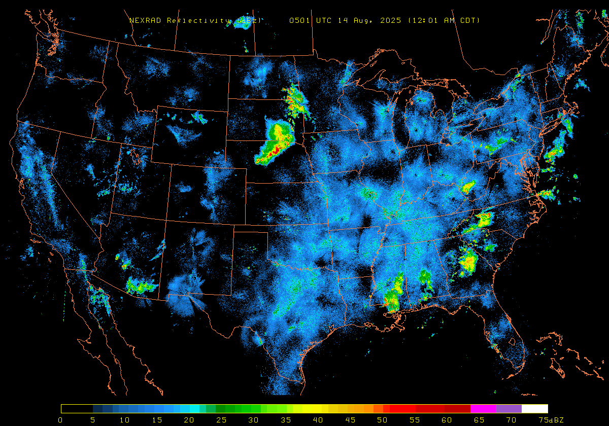 NEXRAD Base Reflectivity & Wind Maps: August 13, 2025 at 3pm ET to next day at 3pm (2 frames/hour)