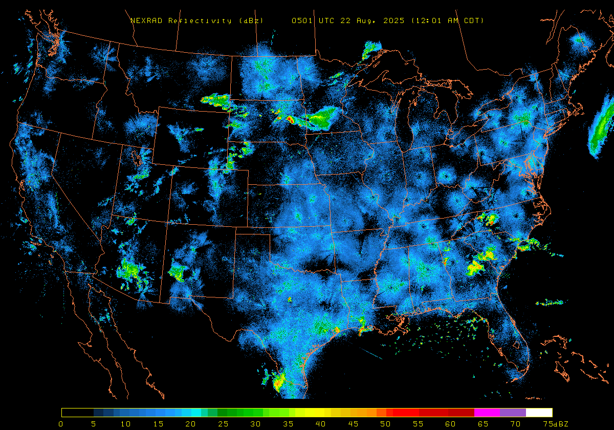 NEXRAD Base Reflectivity & Wind Maps: August 21, 2025 at 3pm ET to next day at 3pm (2 frames/hour)