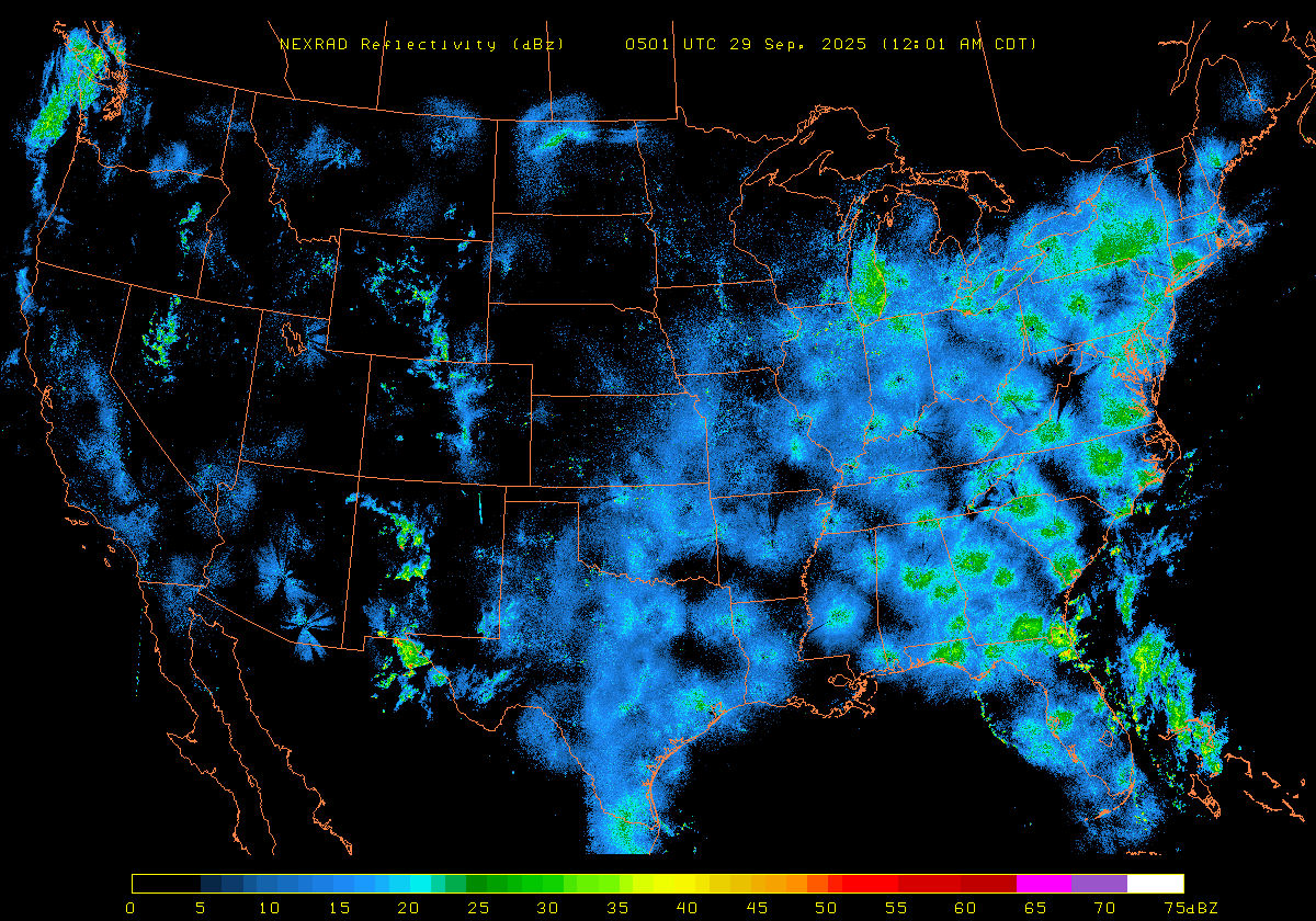 NEXRAD Base Reflectivity & Wind Maps: September 28, 2025 at 3pm ET to next day at 3pm (2 frames/hour)