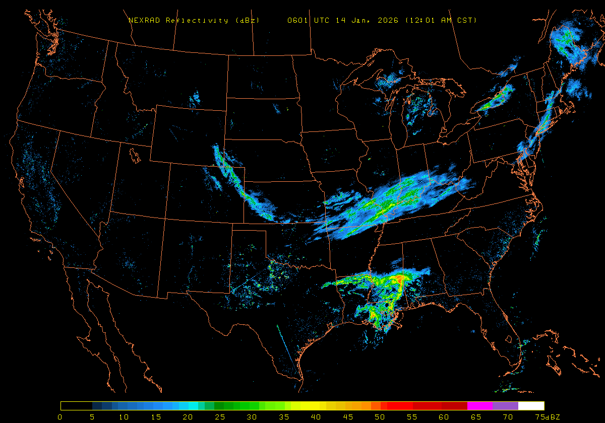 NEXRAD Base Reflectivity & Wind Maps: January 13, 2026 at 3pm ET to next day at 3pm (2 frames/hour)