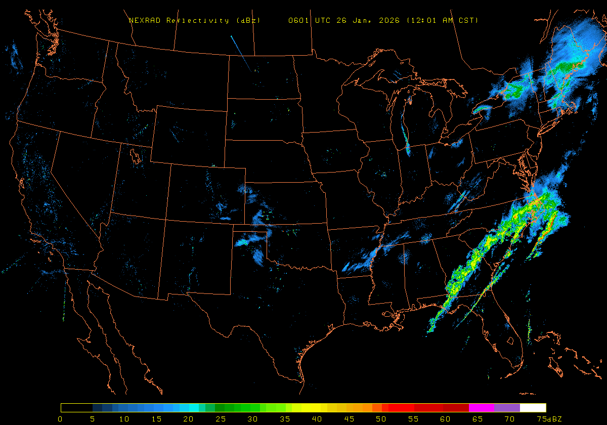 NEXRAD Base Reflectivity & Wind Maps: January 25, 2026 at 3pm ET to next day at 3pm (2 frames/hour)