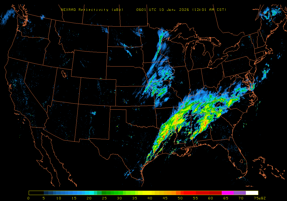NEXRAD Base Reflectivity & Wind Maps: January 9, 2026 at 3pm ET to next day at 3pm (2 frames/hour)