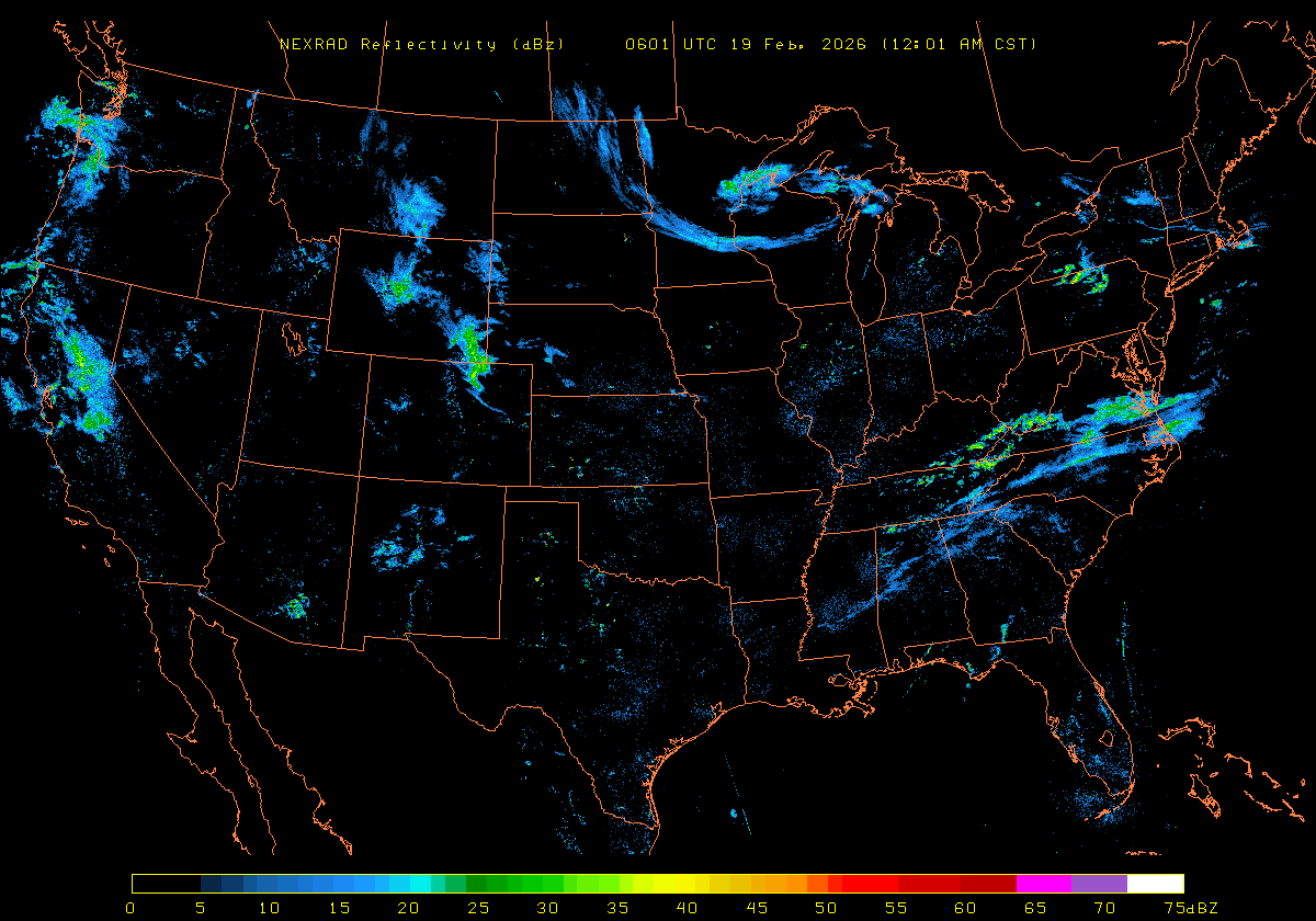 NEXRAD Base Reflectivity & Wind Maps: February 18, 2026 at 3pm ET to next day at 3pm (2 frames/hour)