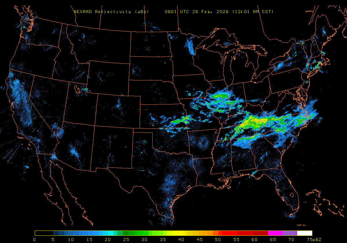 NEXRAD Base Reflectivity & Wind Maps: February 25, 2026 at 3pm ET to next day at 3pm (2 frames/hour)