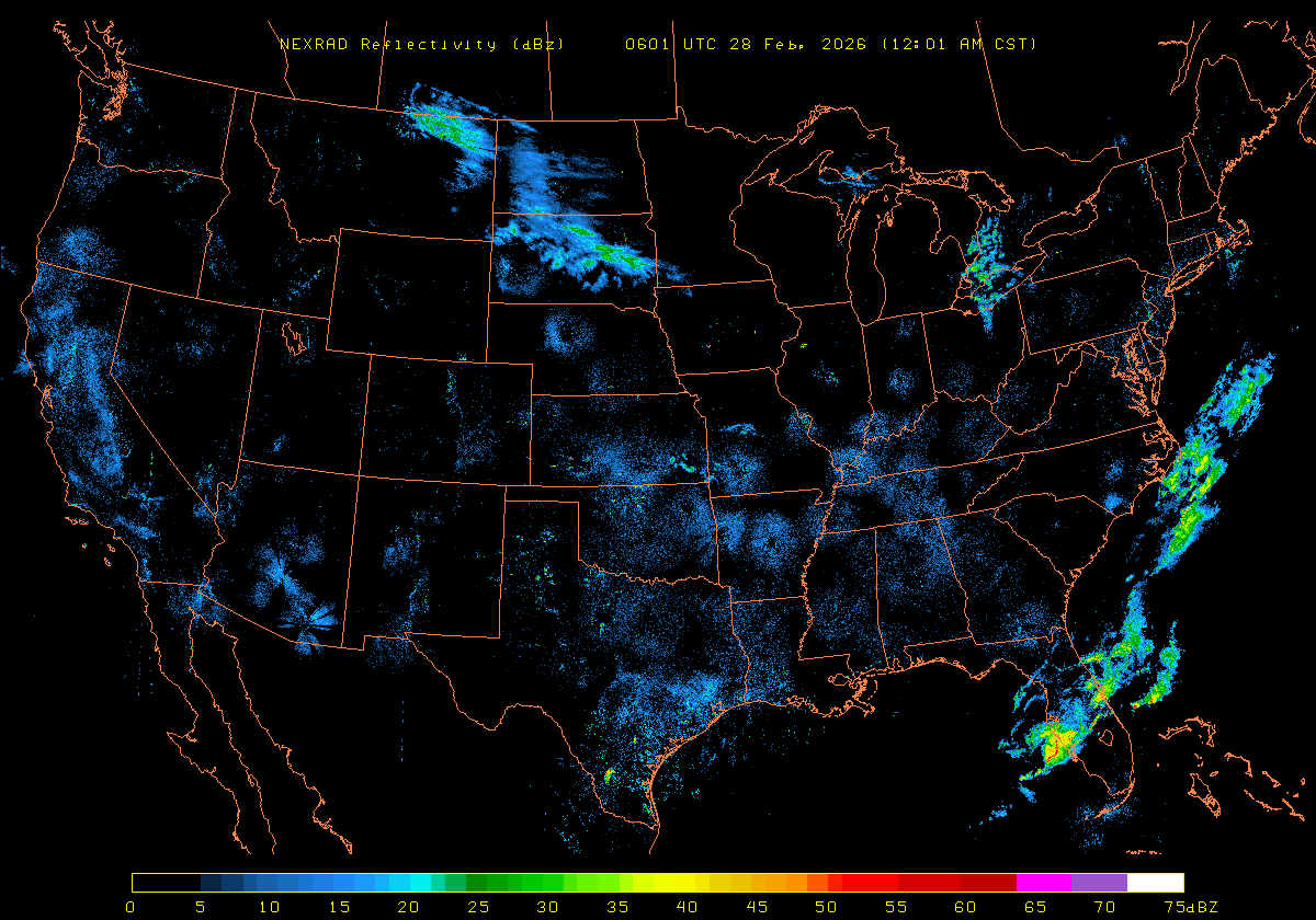 NEXRAD Base Reflectivity & Wind Maps: February 27, 2026 at 3pm ET to next day at 3pm (2 frames/hour)