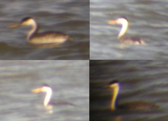 Next, have a look at bill color. The photos aren't easy to compare here, but if you look carefully you can see that the Clark's have a brighter yellow bill than the slightly more dull yellow bill of Westerns. |