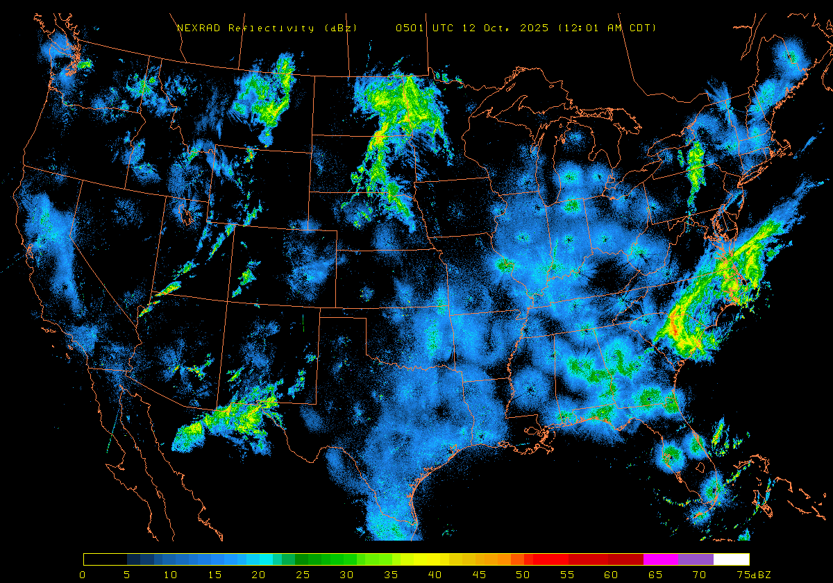 NEXRAD Base Reflectivity & Wind Maps: October 11, 2025 at 3pm ET to next day at 3pm (2 frames/hour)