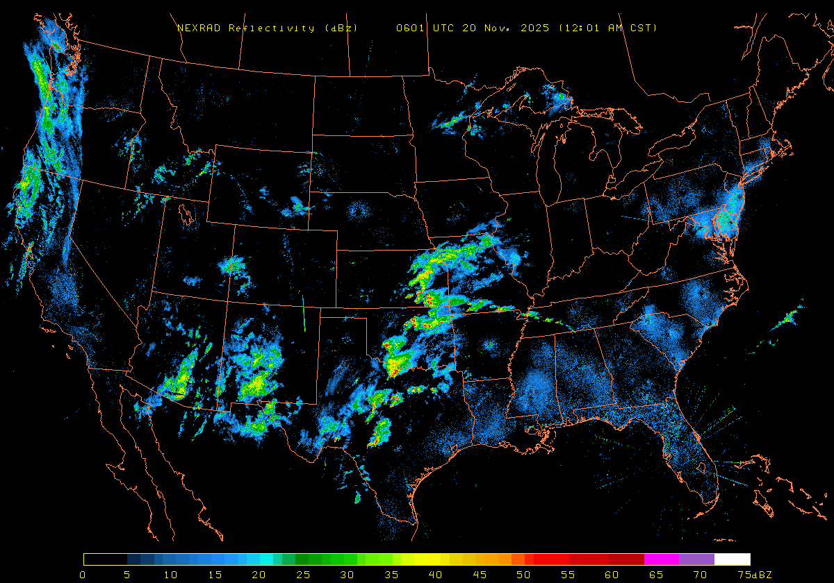 NEXRAD Base Reflectivity & Wind Maps: November 19, 2025 at 3pm ET to next day at 3pm (2 frames/hour)