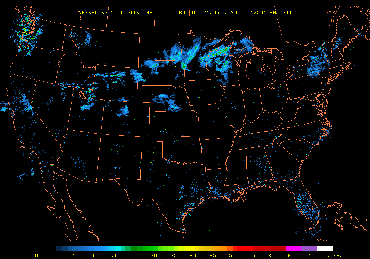NEXRAD Base Reflectivity & Wind Maps: December 19, 2025 at 3pm ET to next day at 3pm (2 frames/hour)
