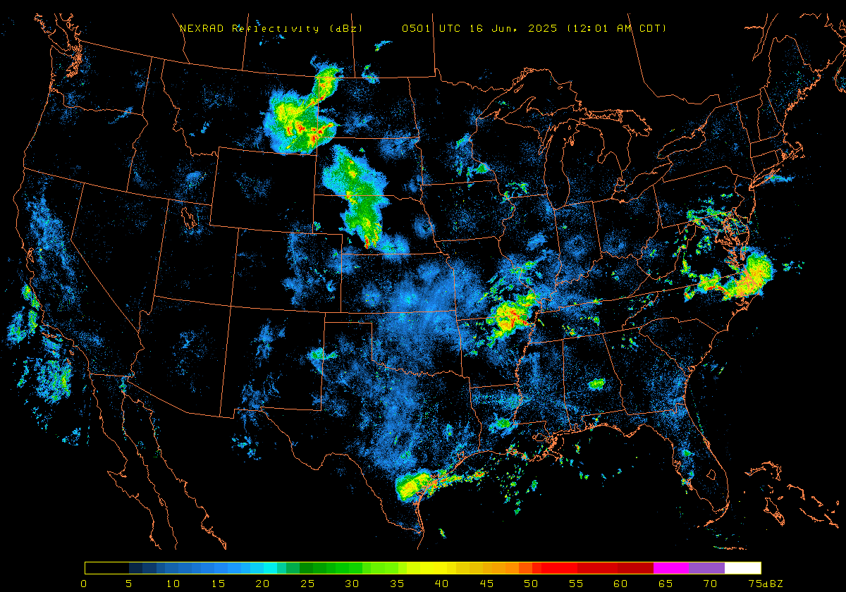 NEXRAD Base Reflectivity & Wind Maps: June 15, 2025 at 3pm ET to next day at 3pm (2 frames/hour)