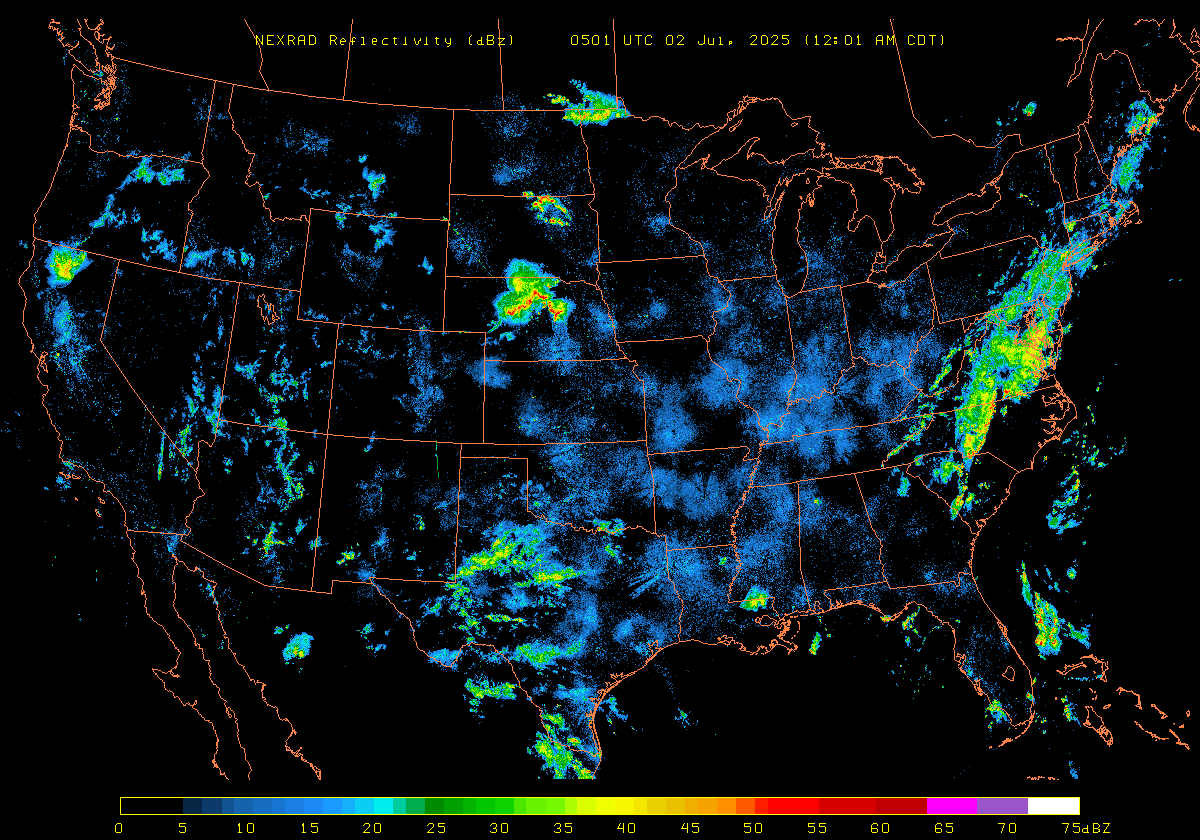 NEXRAD Base Reflectivity & Wind Maps: July 1, 2025 at 3pm ET to next day at 3pm (2 frames/hour)