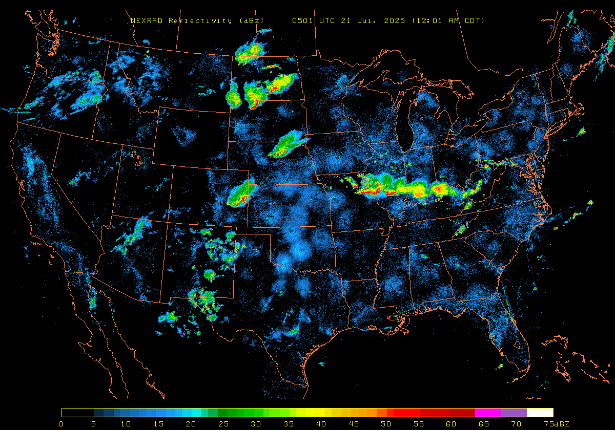 NEXRAD Base Reflectivity & Wind Maps: July 20, 2025 at 3pm ET to next day at 3pm (2 frames/hour)