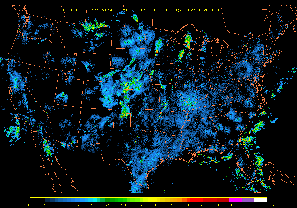 NEXRAD Base Reflectivity & Wind Maps: August 8, 2025 at 3pm ET to next day at 3pm (2 frames/hour)