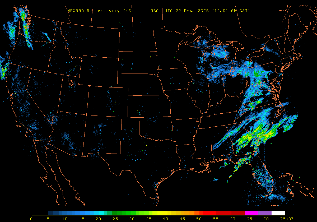 NEXRAD Base Reflectivity & Wind Maps: February 21, 2026 at 3pm ET to next day at 3pm (2 frames/hour)